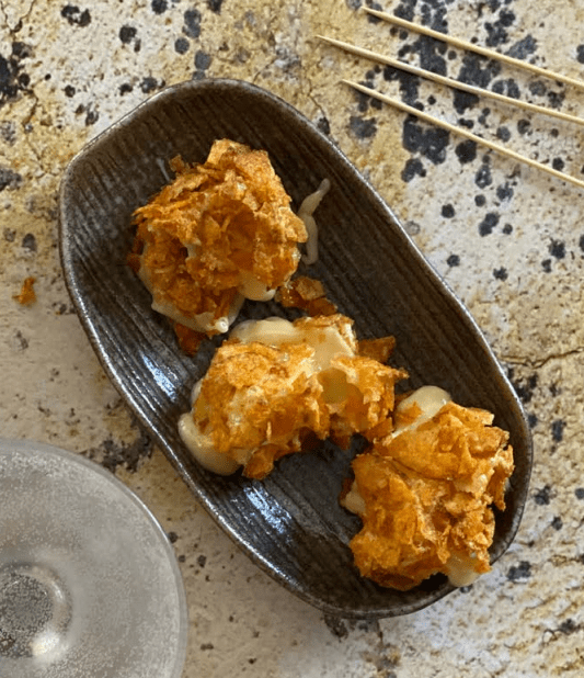 - Roulez les morceaux de fromage dans la farine, puis l’oeuf, puis les chips.